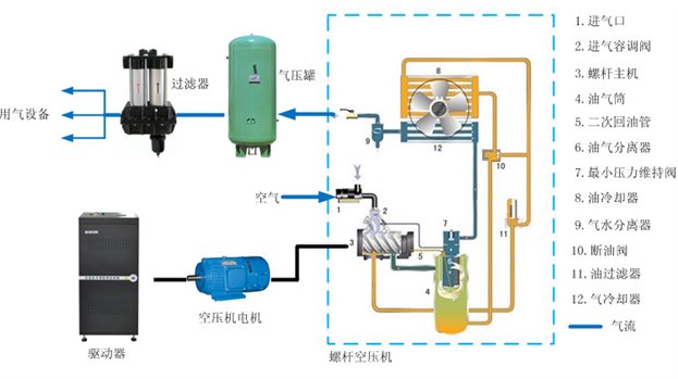 螺杆式空压机的工作原理如下图所示,空气经空气过滤器和吸气调节阀而吸入。该调节阀主要用于调节气缸、转子 及滑片形成的压缩腔,阴、阳转子旋转相对于气缸里偏心方式运转。滑片安装在转子的槽中,并通过离心力将滑片推至 气缸壁,高效的注油系统能够确保压缩机良好的冷却及润滑油的最小舒适耗量,在气缸壁上形成的一层薄薄的油膜可以 防止金属部件之间直接接触而造成磨损。经压缩后的空气温度较高,其中混有一定的油气,经过油气分离器进行分离之 后,油气经过油冷却器冷却再经过油过滤器流回储油罐,空气经过气冷却器(空气冷却装置)进行冷却而进入储气罐。
